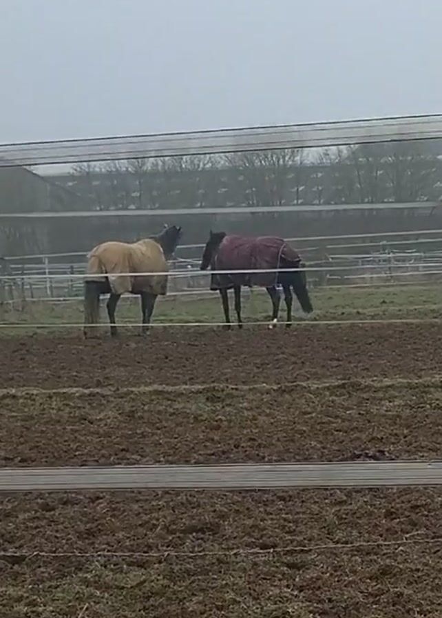 two horses in a muddy paddock on a misty day. One horse is light brown with a dark head and is wearing a light-colored blanket. The other horse is dark and wearing a maroon blanket. The horses are standing near each other and touching heads, then the light-colored horse moves its head. The paddock is surrounded by white electric fencing. Beyond the paddock, trees and a building are visible in the background.