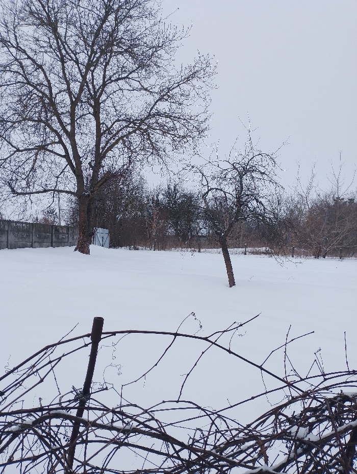 This image depicts a snow-covered, dormant outdoor landscape in Yarun, Ukraine, under an overcast sky. The foreground features a dense mass of bare, dark branches, likely from a vine or shrub, partially dusted with snow. A dark, possibly rusty, metal post acts as a support within these branches. The midground consists of an expanse of untouched white snow, with several bare deciduous trees or saplings emerging from it. To the far left midground, a gray concrete or stone fence is visible behind the snow-covered ground, partially obscured by a large, prominent deciduous tree. Beneath this tree and behind the fence, a small, light-colored utility box or shed is present. The background is characterized by a line of various bare trees and shrubs, forming a darker horizontal band beneath a uniformly light gray sky. No human or animal subjects are present, and there are no discernible actions or interactions occurring within the scene.