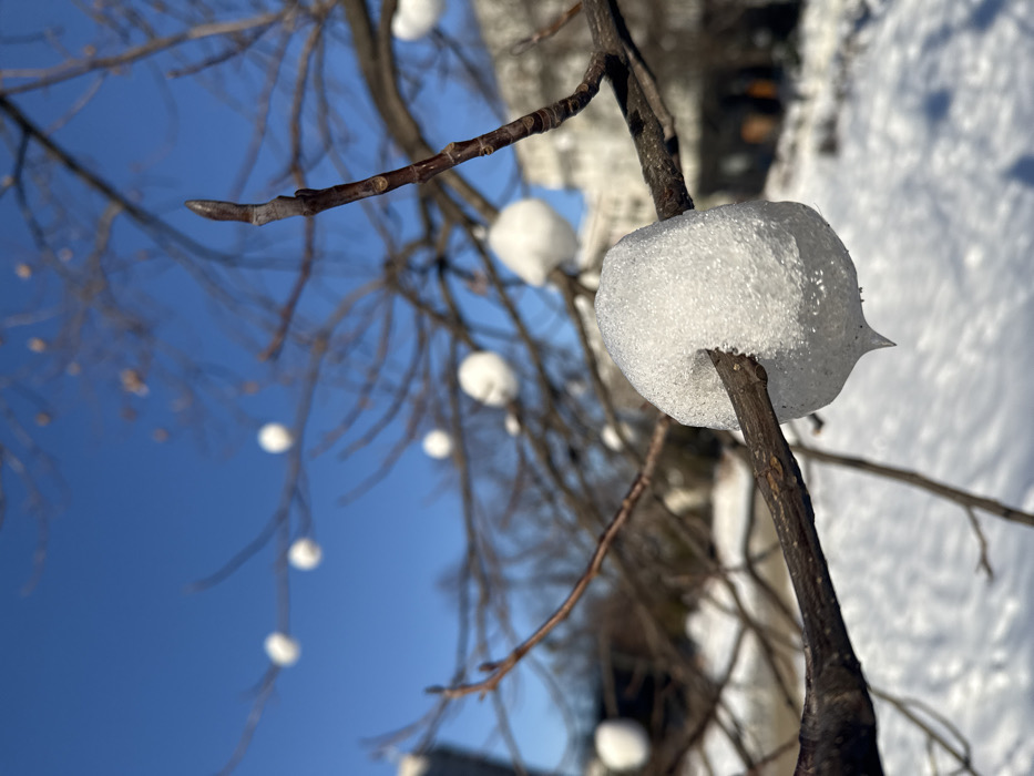 The image presents a forensic close-up of a winter scene in Warsaw, Poland. A bare, dark brown tree branch, devoid of leaves, occupies the foreground, extending from the lower-left upward and right. A substantial accumulation of white, granular snow adheres to this branch, forming a bulbous shape approximately 10-15 cm in diameter, with a distinct pointed icicle-like protrusion at its bottom. The snow's surface exhibits crystalline textures, indicating partial melting and refreezing. In the midground, additional bare tree branches, out of focus, bear numerous smaller, spherical snow formations. The background features a clear, cloudless, deep blue sky and a blurry expanse of white snow covering the ground. Distant, indistinct light-colored buildings are faintly visible on the horizon line, partially obscured by the foreground and midground elements. The scene is brightly illuminated by direct sunlight, casting no significant shadows.