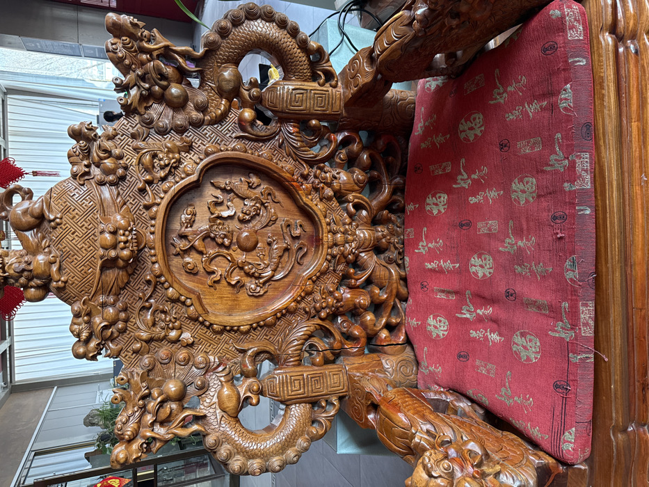 The scene displays a large, elaborately carved wooden chair situated indoors in Chaoyang District, China