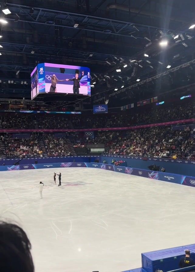 figure skating competition in a packed arena. A pair of skaters are performing on the ice. A large screen above the ice shows a close up of the skaters. The stands are filled with spectators. A photographer stands near the edge of the ice. The backdrop has text that reads "Milano Cortina 2026" with the Olympic rings. The skaters wear elegant costumes and glide across the ice in sync.