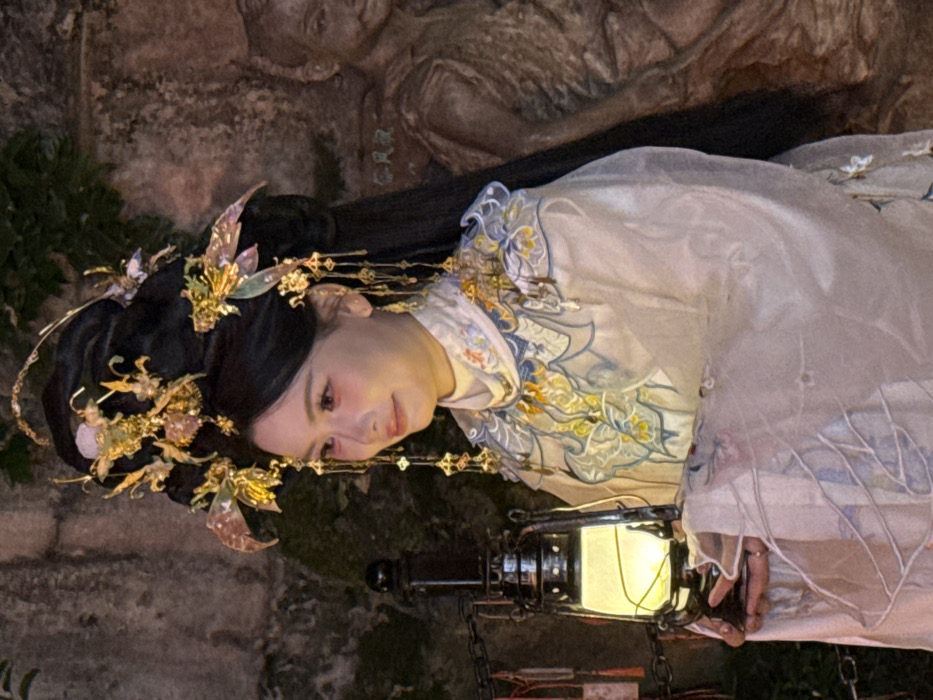 An image taken in Yuzhong District, China, shows a female individual in traditional Chinese attire, illuminated by a lantern, at what appears to be a night-time or dimly lit outdoor setting