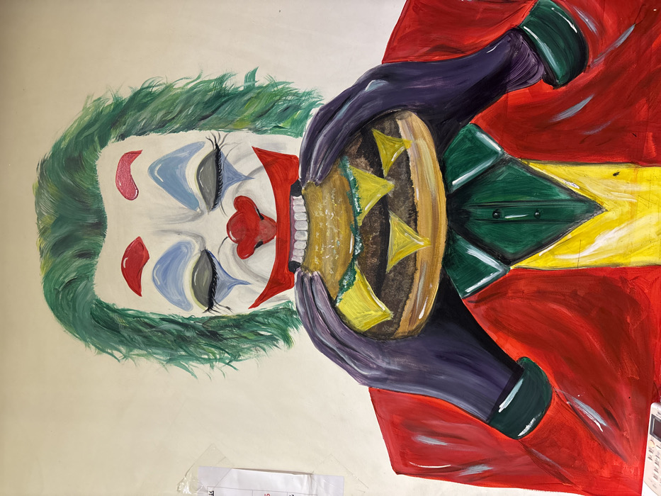 The image displays a vibrant, vertically oriented mural painted on a plain, light-colored wall within Rukn ad-Din Municipality, Syria. The artwork depicts the upper torso of the Joker character, characterized by green, tousled hair, a white painted face with closed eyes featuring blue eyeshadow and black tear streaks, a prominent red nose, and a wide red grin exposing white teeth. The character is shown in the act of biting into a large cheeseburger, held by both hands encased in dark purple gloves. The burger is detailed with a bun, a substantial patty, and multiple slices of yellow cheese, some exhibiting distinctive triangular cutouts. The Joker wears a red suit jacket with green lapel accents over a yellow and green patterned shirt. A white calendar page, affixed to the wall with transparent tape, is partially visible on the far left, positioned adjacent to the artwork.