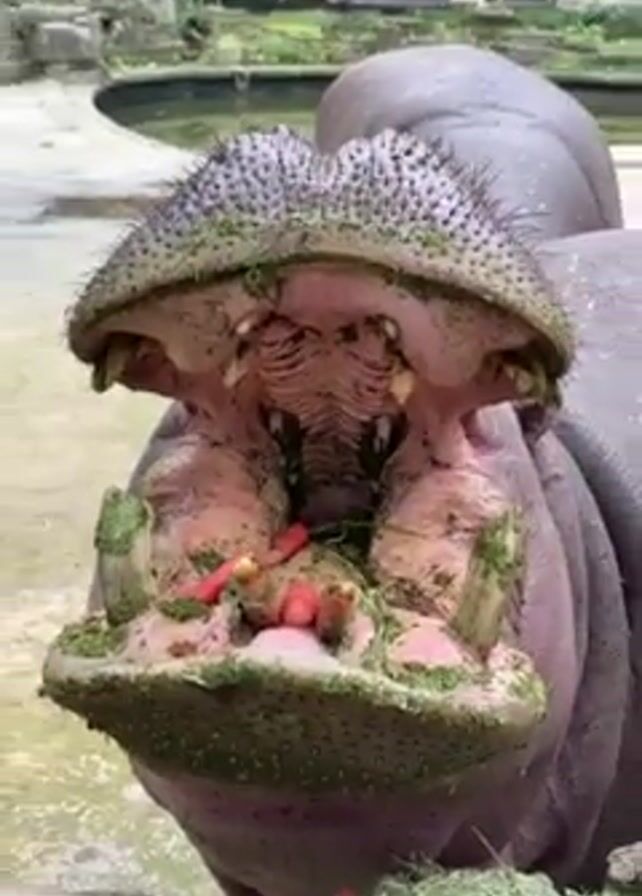 - "A large hippopotamus is standing outside and has its mouth wide open" by FM-K0Kp62, licensed under CC BY 4.0