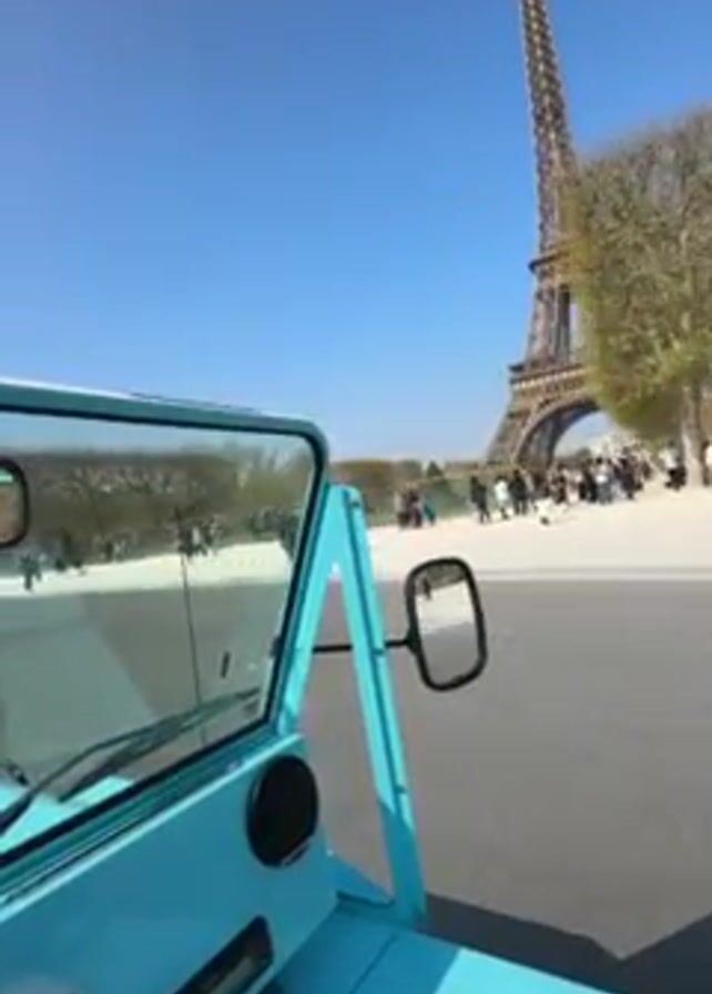 driver's perspective from inside a light-blue, open-top vehicle driving towards the Eiffel Tower in Paris