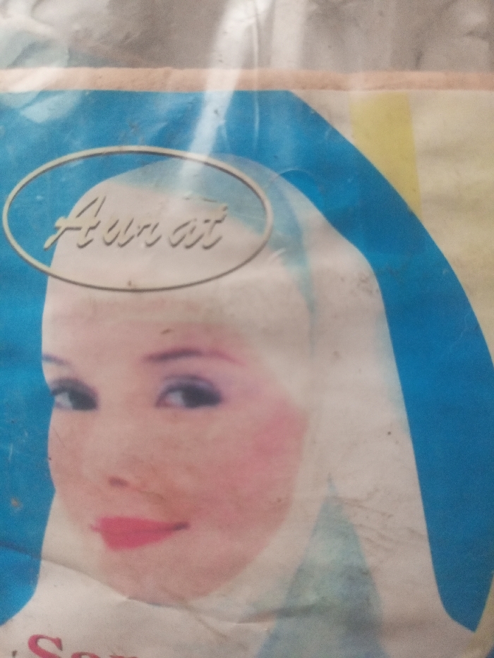 This image displays a detailed close-up of a printed graphic, likely from product packaging or a sign, located in Zee Pin Kone, Myanmar. The central subject is a stylized depiction of a woman's face, positioned to look directly forward with a subtle smile. She has light-toned skin, dark eyes accentuated with eyeliner and mascara, and lips colored bright pink. Her head is covered by a plain, light-colored fabric, which conceals her hair. Above her head, within a light-colored oval outline, the word "Auraat" is visible in a decorative script. A partial red word, "Sen," is located at the bottom left of the frame. The immediate background surrounding the woman's face is a curved light blue, transitioning to a vertical yellow stripe on the right side of the image. The entire surface of the graphic exhibits wear, including wrinkles and specks of dust or dirt, consistent with a clear plastic overlay or a weathered paper/plastic material.