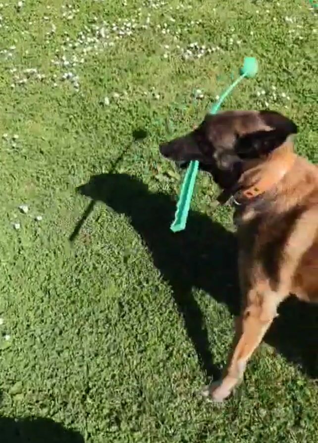 - "A tan-colored, short-haired dog runs through a grassy yard carrying a green plastic object in its mouth" by FM-Hxjuj2, licensed under CC BY 4.0