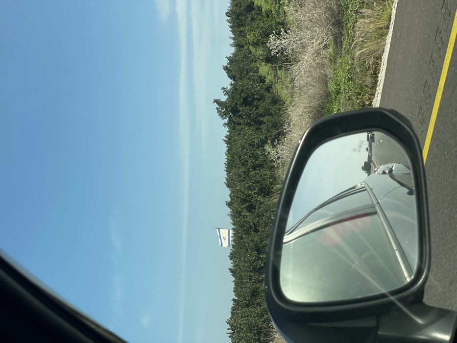 The image depicts a rural or semi-rural landscape, taken from the interior of a vehicle. In the foreground, the dark A-pillar and exterior side mirror of the vehicle are visible on the left. The side mirror reflects a portion of the vehicle's body and the road behind, showing multiple vehicles in the distance on what appears to be a highway. To the right of the mirror, an asphalt road with a solid yellow line on its edge is present. The immediate roadside features dry, light-colored shrubbery and green vegetation. In the midground, a dense expanse of uniform green trees, consistent with an orchard or plantation, stretches horizontally across the scene. Above and slightly to the left of the center of this tree line, an Israeli flag, characterized by two blue horizontal stripes and a central blue Star of David on a white field, flies from a pole. The background consists of a clear, light blue sky with minimal, high-altitude cloud cover. The scene is located in the Hof HaCarmel Regional Council, Israel. No people are visible.