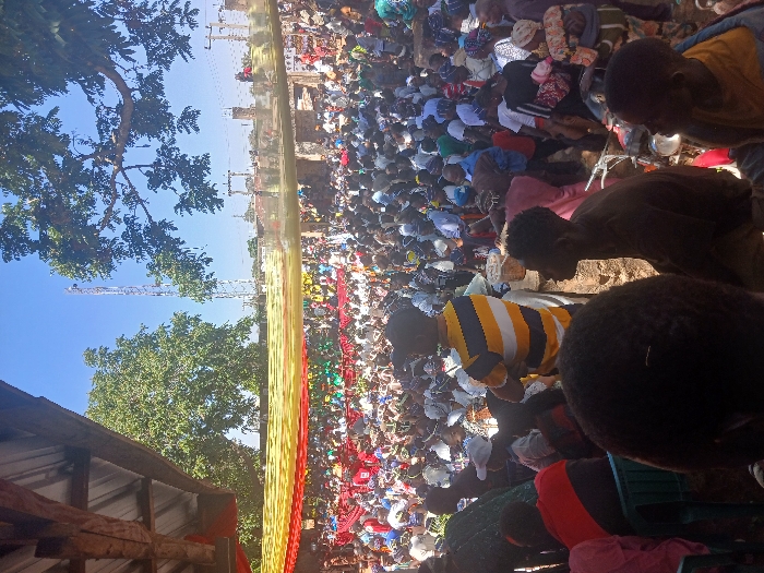 An outdoor scene in Gwolong, Nigeria, depicts a densely packed gathering of several hundred people under a clear blue sky