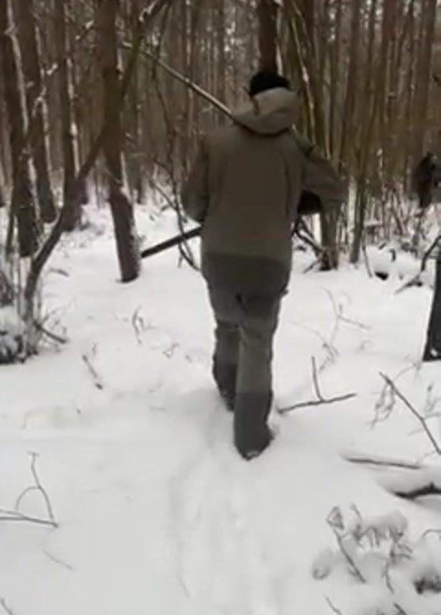 A person is walking through a snowy forest. The individual is wearing a green jacket, grey pants, a black hat, and is carrying what appears to be a long object over their shoulder. The camera follows them from behind. The forest consists of tall, bare trees and a ground covered in snow. Other people are visible in the background. The snow appears to have a light, powdery texture.