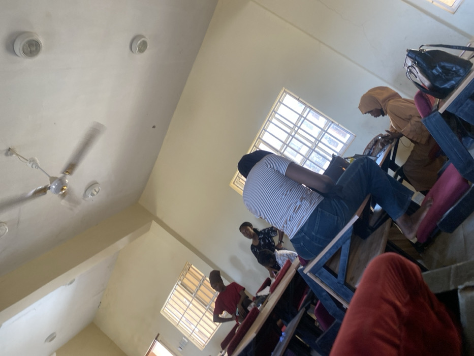 The image captures an indoor scene in Baganakwo, Nigeria, depicting a room that appears to be a classroom or study area