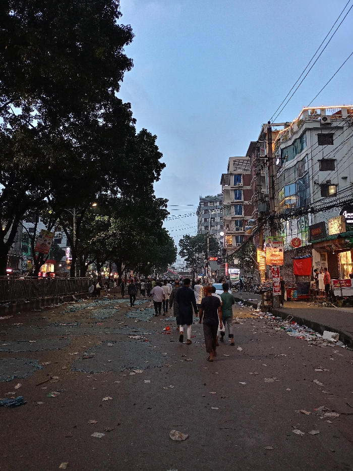 The image captures an urban street scene in Dhaka, Bangladesh, during twilight. The asphalt road surface is heavily strewn with debris, predominantly large, light-colored fragments of broken glass, mixed with scattered paper and miscellaneous refuse, indicating a recent disruption. On the left, a dense line of mature trees borders the street, with a metal barrier along the curb and streetlights visible amongst the foliage. The right side of the street is lined with multi-story buildings, featuring various illuminated commercial establishments at ground level, including a store sign for "4 Seasons." Numerous utility poles with a dense network of overhead wires are prominent along this side. Approximately 20 to 30 individuals, primarily men dressed in casual South Asian attire, are observed in the midground, walking away from the camera's perspective along the debris-covered roadway. Their gait appears unhurried. Piles of refuse are also visible along the curb on the right. No vehicles are prominent in the immediate vicinity.
