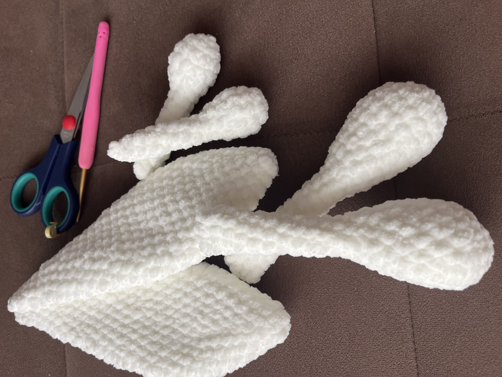- "The image depicts a collection of white, soft, possibly crochet or knitted items resembling bunny ears laid out on a brown textured surface" by FM-auqI32, licensed under CC BY 4.0