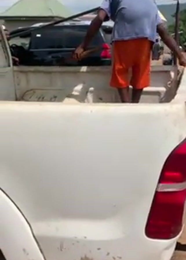 A man in a light blue shirt and orange shorts is standing in the bed of a white pickup truck, appearing to adjust or place items. Inside the truck bed is a large white object wrapped in material. The truck is parked on a dirt lot with other cars, people, and buildings visible in the background. The camera is close to the back of the truck, focusing on the man and the contents of the truck bed. There is a green awning above the truck.