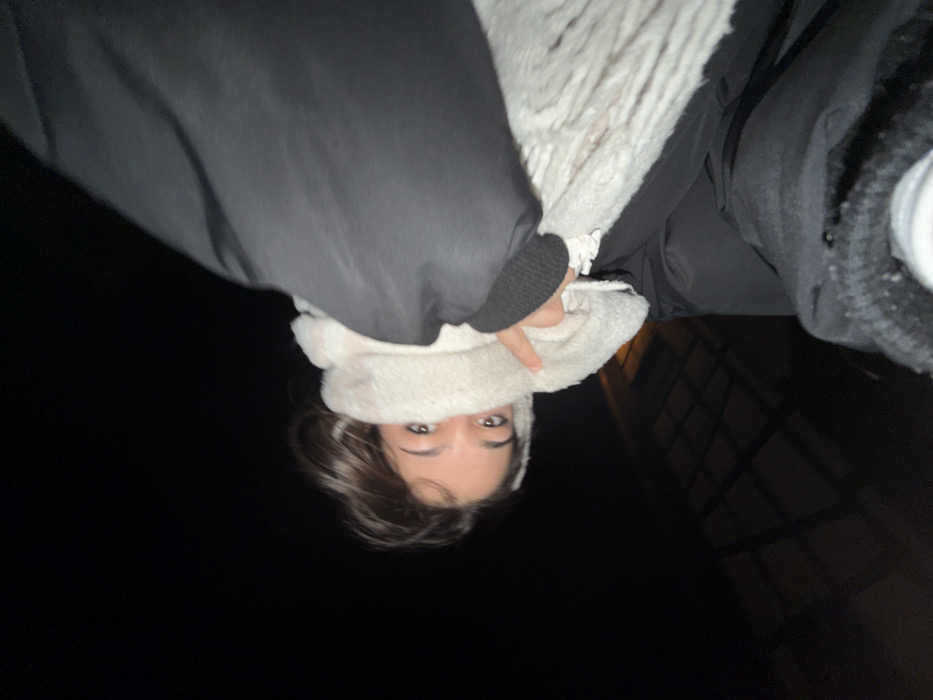 A person is oriented upside down, posing in low light. Visible are their eyes, part of their face, and dark hair. They wear a thick, white, fuzzy neck warmer or scarf. The person is wearing a dark jacket, possibly with a lighter-colored lining. The background is mostly dark, but a building structure is faintly discernible. The overall image has a selfie-like quality.