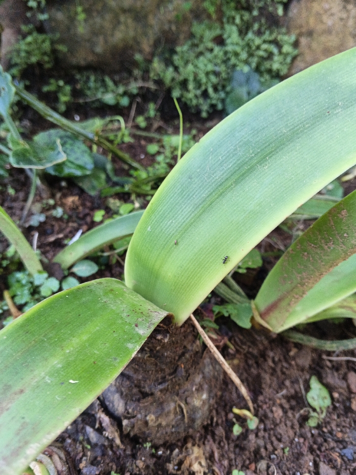 A close-up shows green leaves with parallel veins emerging from the soil. Small, green plants and moss grow in the background. An ant walks on one of the leaves. The soil appears moist. Reddish-brown accents mark the edges of some leaves.