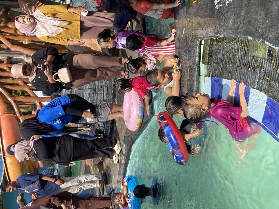 A vibrant scene unfolds at a water park with several children enjoying the pool. Some wear colorful swimsuits and floatation devices, while others stand at the pool's edge. Adults, including women wearing hijabs, are nearby, some dressed in casual attire and observing the children. One woman is using a phone. The setting features artificial rock structures and blue and white tiled pool edges, creating a cheerful atmosphere.