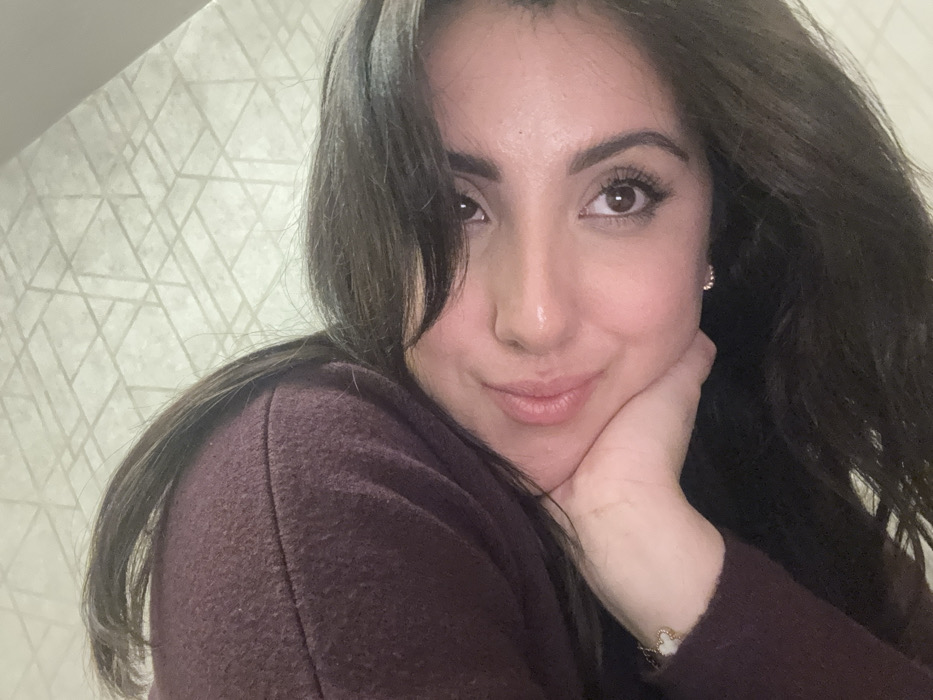 A single individual, appearing female, is depicted in a medium close-up, angled portrait. The individual's head is tilted to the left, with their right hand supporting their chin and jawline. They have long, dark hair and wear a dark maroon long-sleeved garment. A light-colored bracelet with a four-leaf clover design is visible on their right wrist, and a small, light-colored earring adorns their right earlobe. The individual gazes directly at the camera with a subtle smile. The background consists of an indoor wall featuring a repeating geometric pattern of light-colored intersecting lines on a slightly darker, plain surface. No specific city or outdoor location within Baden, Austria, is discernible from the visual evidence.