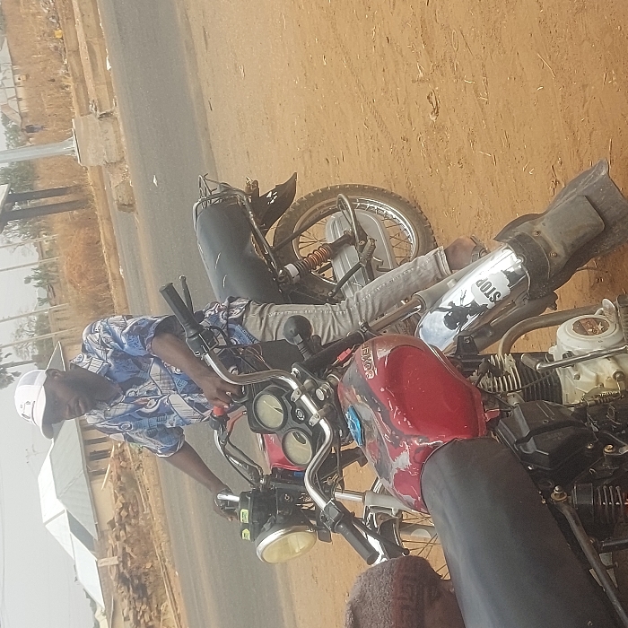 A person wearing a patterned shirt and a white cap is sitting on a red motorcycle. The motorcycle is lying on its side on a dirt road, with the back wheel visible. The motorcycle's fuel tank is labeled "BOXER". A "STOP" sticker is on the frame near the seat. The background consists of a road, dirt, and distant buildings.