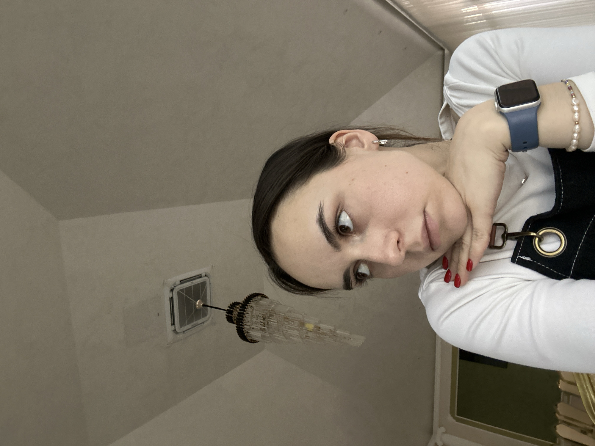 A woman is visible in the image, positioned against a backdrop of a ceiling and walls. She has dark hair, fair skin, and is wearing an Apple watch and a pearl bracelet on her left wrist. She is also wearing a white long-sleeved shirt and a dark apron. Her fingernails are painted red. A chandelier hangs from the ceiling near an air vent. The location is посёлок опытного хозяйства «Ермолино», Russia.