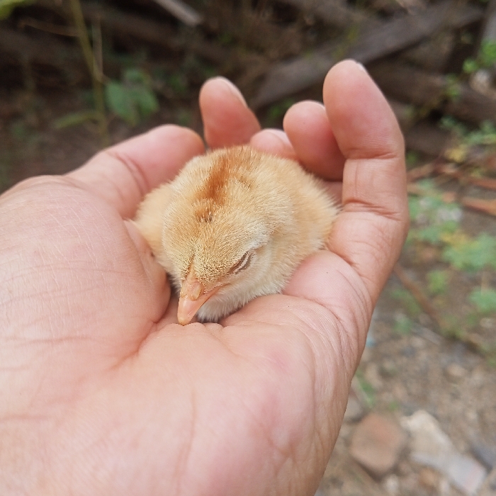 - "A light brown chick is resting with its eyes closed in the cupped palm of an individual's hand" by FM-cHJi83, licensed under CC BY 4.0