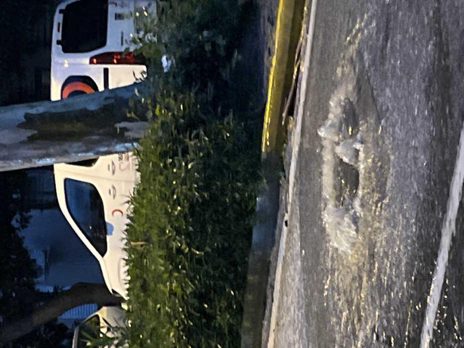Two white vehicles, possibly vans, are partially visible behind green foliage. One has a red crescent symbol. A tree trunk and branches obscure parts of the vans. The foreground shows wet pavement with a pothole or other depression containing water. Yellow curb markings are also visible. The image appears to be taken at night or in low light conditions.