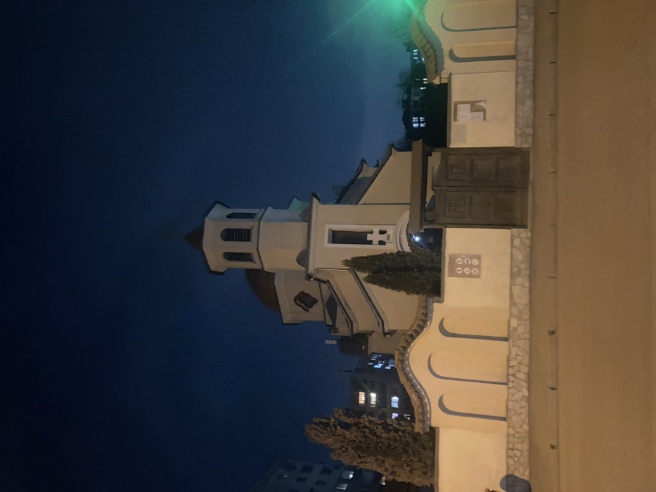 An exterior, nighttime wide shot depicts the Church of St. Nikolay of Sofia (Църква "Св. Николай Софийски") on Opălchenska Street in Sofia, Bulgaria. The central subject is a light cream-colored Eastern Orthodox church, featuring a prominent bell tower with a dark, conical roof and arched belfry openings, situated in front of a larger, dark dome. The church building has multiple rooflines and windows. The church grounds are enclosed by a low perimeter wall, constructed with a light-colored stucco upper section and a stone base. The wall incorporates decorative arched segments along its length and is topped with dark tiles. A dark brown, double-leaf wooden gate, topped with a wooden lintel, serves as the main entrance, centrally located in the wall. To the left of the gate, a rectangular panel with six circular mosaic or tile designs is affixed to the wall. To the right of the gate, a notice or poster is visible. Two slender, dark green coniferous trees, possibly cypresses or thujas, stand within the walled enclosure, positioned on either side of the church's main facade. The immediate foreground shows a paved street or sidewalk, illuminated by artificial light. In the background, particularly to the left, multi-story residential buildings with illuminated windows are discernible, indicating an urban setting. The sky is a deep, dark blue, consistent with nighttime conditions. Artificial lighting illuminates the church and wall with a warm yellow hue. A strong green light flare is present on the right side of the image, originating from an external light source. No individuals or active subjects are present in the scene.