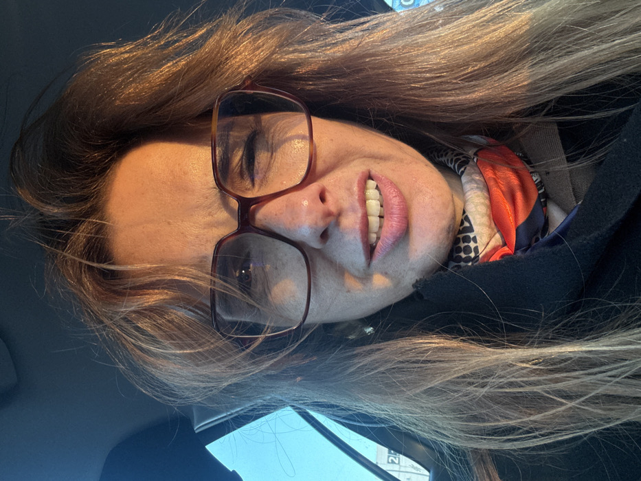 A female individual is captured in a close-up, chest-up selfie-style photograph inside a vehicle in Chassieu, France