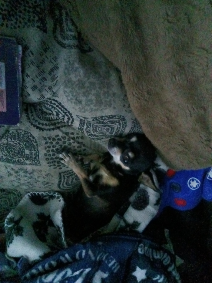 The scene depicts an indoor setting in Park Hill, United States. A small, tricolor dog, predominantly black with tan and white markings on its face and chest, is lying on its back or side on a green and grey patterned blanket. The dog's head is oriented towards the upper right of the frame, with its eyes partially open. A light brown, fluffy blanket partially covers the dog from the right. To the right of the dog's head, a blue, segmented plush toy with a white spiderweb design is visible. In the upper left quadrant, a dark rectangular object, possibly a book or box, is present. A dark blue blanket with white stars and partial text is visible in the lower foreground. No human subjects are present.