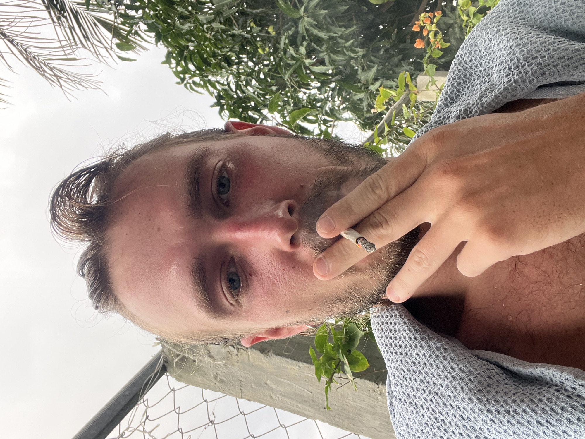 A close-up, rotated selfie taken outdoors, features a light-skinned male with blue eyes and light brown hair, exhibiting stubble beard. He is holding a lit cigarette near his mouth with his right hand. He appears to be wearing a blue waffle-patterned shirt or towel. In the background, there's a fence, concrete, and green foliage, including what appears to be palm fronds and other vegetation. The overcast sky suggests an outdoor environment. It is difficult to pinpoint the exact location in Tây Nha Trang, Vietnam without further visual or contextual clues.