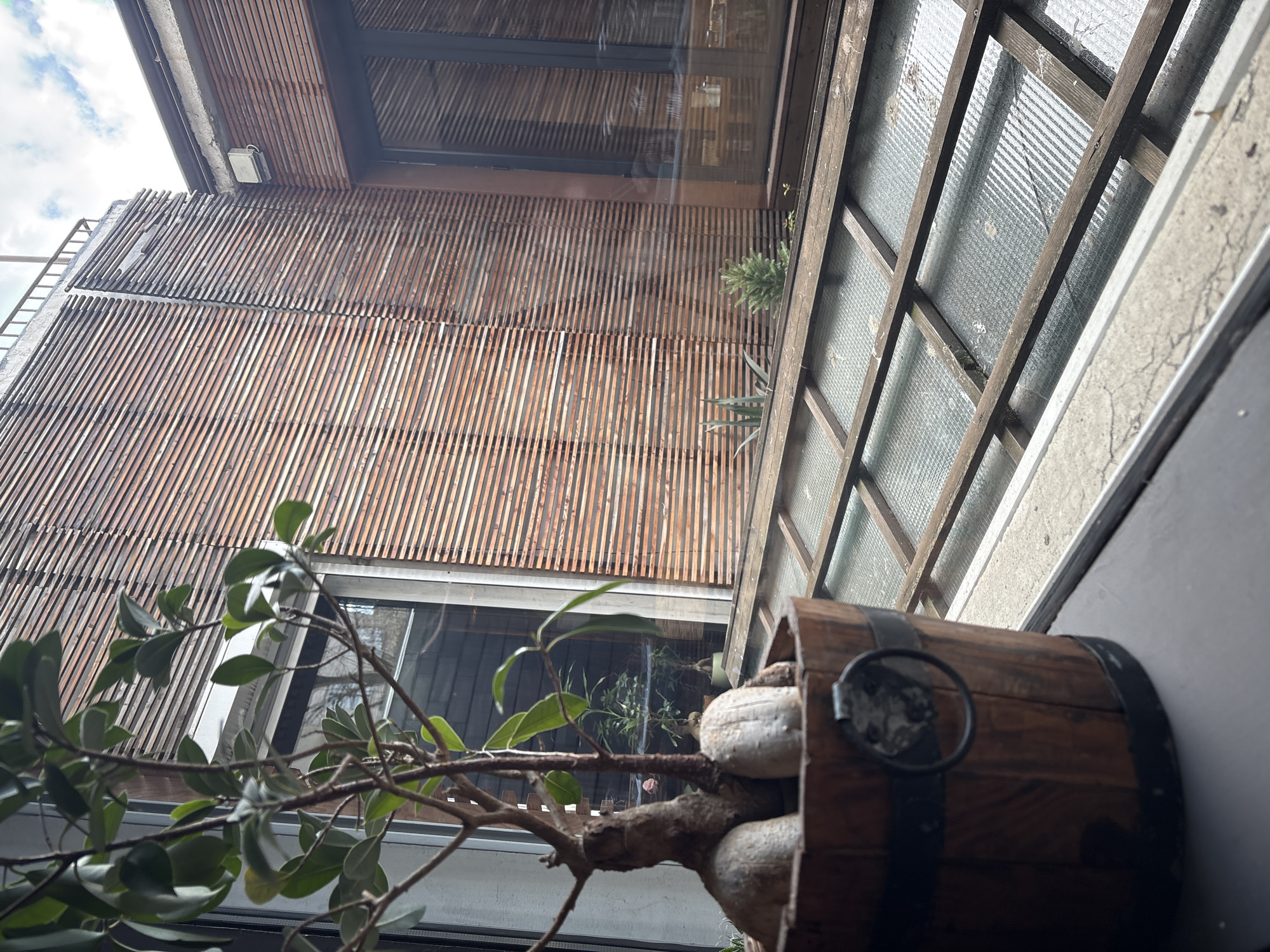 The image depicts a Ficus microcarpa 'Ginseng' plant, characterized by its thick, exposed caudex roots, vibrant green leaves, and slender branches, situated in a rustic wooden barrel planter with dark metal bands and a ring handle. The planter rests on a dark window sill, indicating an indoor perspective looking outwards. Through the clear window, a modern urban environment in Sofia, Bulgaria, is visible. The predominant feature is the exterior facade of a building constructed from numerous horizontal wooden slats, exhibiting a medium-brown tone with signs of weathering. To the right, another window or glass door framed in dark material reflects portions of the surrounding architecture and sky. Below the main window, an outdoor structure is visible, comprising dark wooden beams arranged in a grid pattern over translucent or frosted glass panels, resembling a skylight or a structured patio roof. On this lower level, small green plants, including a compact conifer sapling and a spiky succulent, are observed. Above the wooden facade, a segment of a concrete upper building edge and a dark metal railing are discernible against a partially cloudy sky. A white rectangular electrical box is affixed to the wooden slat facade in the upper right portion of the image. No individuals are present, and no actions or interactions are depicted. The overall scene suggests a contemporary commercial or residential building within an urban setting in Sofia, Bulgaria; however, a precise street address cannot be determined from the visual evidence.