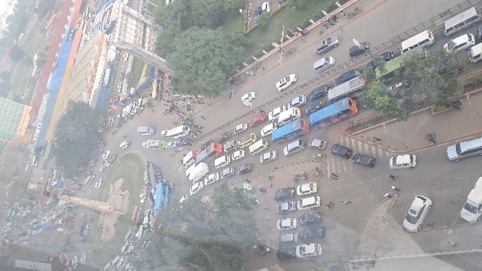 The image presents an elevated view of the Dedan Kimathi Roundabout and surrounding thoroughfares in Nairobi, Kenya, observed during daylight under overcast or hazy conditions