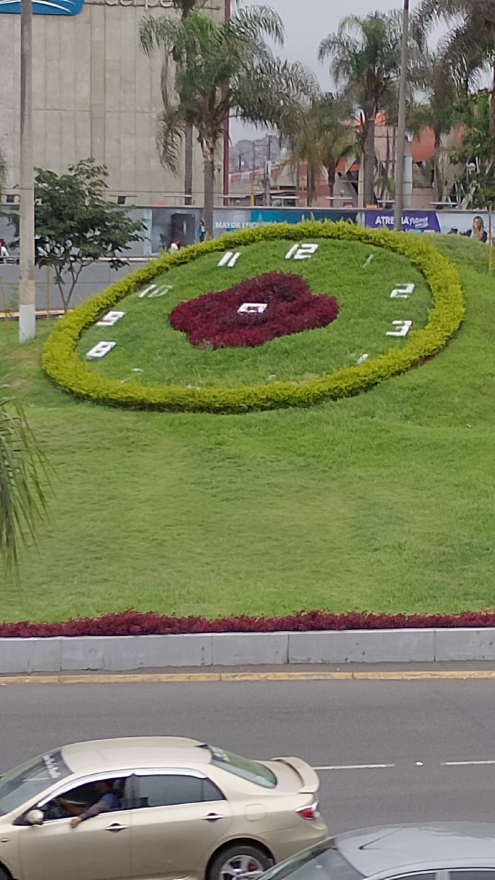 A large, tilted floral clock dominates the scene, set into a grassy hillside. White numerals mark the hours, encircled by green shrubs, with a burgundy floral design at the center. Palm trees rise in the background near a building with a partial view of the words "del Perú". A street runs along the base of the hill with two cars visible, one light gold and another gray, suggesting an urban environment.