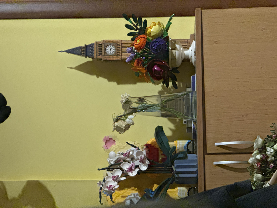 The scene depicts an interior view of a room in Sofia, Bulgaria, focused on a wooden surface, likely a cabinet or shelf, against a plain light yellow wall. The lighting, emanating from the right, casts distinct shadows of the displayed objects onto the wall. From left to right on the wooden surface: 1. An artificial orchid plant with multiple white and pink blossoms, contained within a gray, vertically ribbed pot. Behind it, a colorful, abstract decorative piece in yellow, red, and blue is partially visible against the wall. 2. A clear, geometric glass vase holding several dried, light-colored flowers, possibly wilted roses, partially submerged in water. 3. A detailed miniature model of Big Ben (Elizabeth Tower), displaying a clock face indicating approximately 10:10. 4. A white, fluted pedestal vase containing an arrangement of artificial flowers in vibrant colors, including orange, purple, yellow, and deep red, interspersed with green foliage. The wooden surface extends across the lower portion of the image. Below it, on the left, two light-colored wooden cabinet doors with silver, arched handles are visible. In the bottom left foreground, a dark fabric partially obscures a bunch of dried flowers, primarily light pink and white, resting on a lower, indistinct surface. A dark brown vertical element, possibly a door frame or furniture edge, is visible along the far right edge of the image. No people are present, and no actions are occurring.