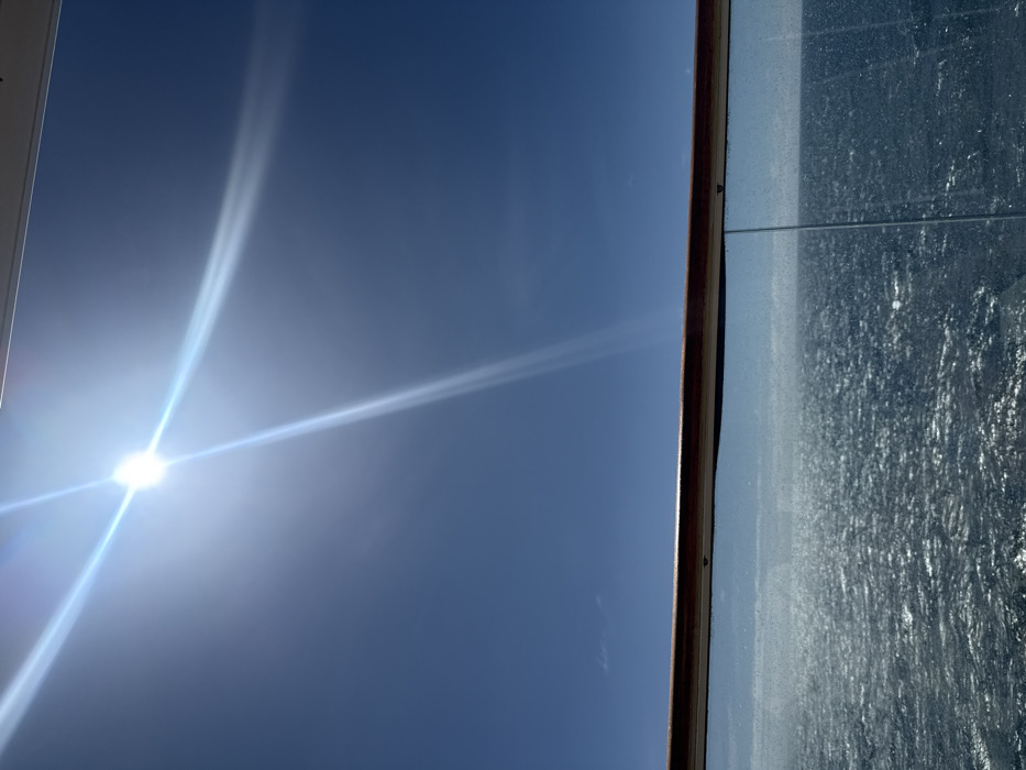A brilliant sun shines in a clear blue sky, its rays streaking diagonally across the frame. To the right, the edge of a window and a railing separate the sky from a view of water. The water's surface is textured with waves, reflecting light.