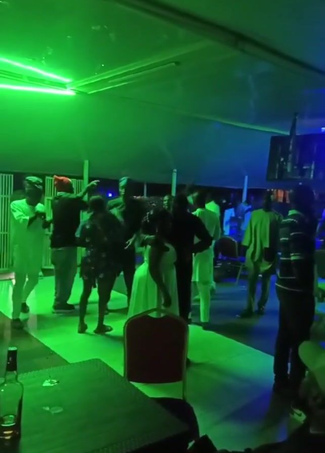 group of people dancing in a room with green lighting. The room appears to be some kind of club, with tables and chairs visible. Some of the people are wearing traditional clothing. One woman is holding a child, and they are both dancing. There is an empty beer bottle on a table in the foreground. People are standing around the edges of the dance floor, and some are watching the dancers.