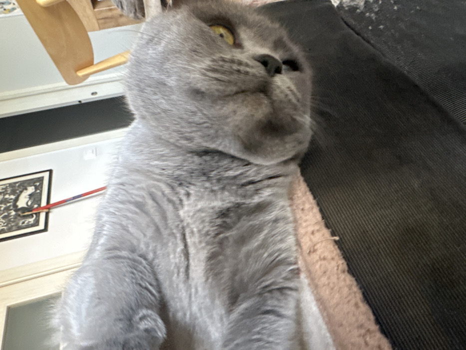 - "A solid gray domestic cat with yellow eyes is shown resting on its left side, facing the right, in an indoor setting within Madrid, Spain" by FM-F4Wp22, licensed under CC BY 4.0
