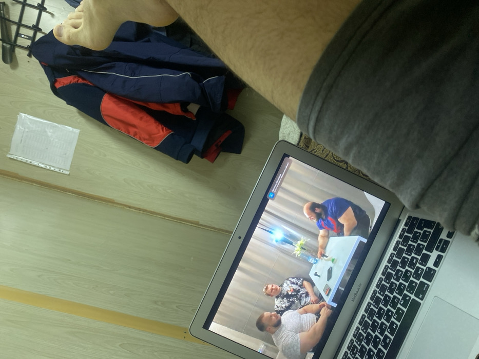 laptop displaying a video featuring three men seated around a table. One man is standing, leaning on the table. A garment is draped nearby, and a human leg is partially visible in the frame. The laptop rests on a surface, with a gray fabric adjacent to it. The surroundings appear to be a room with a wooden floor.