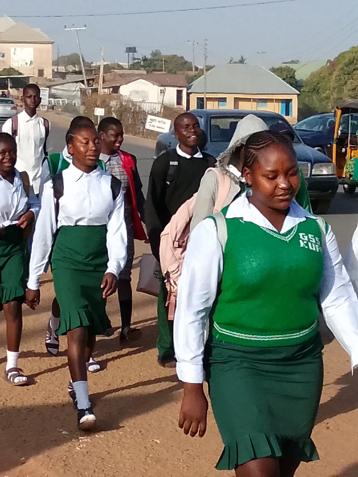 A group of students in school uniforms walks along a road. The uniforms consist of white shirts, green skirts or vests, and some carry backpacks. The students are diverse in appearance and seem to be walking together, possibly to or from school. In the background, there are buildings, vehicles, and a partly sunny sky.