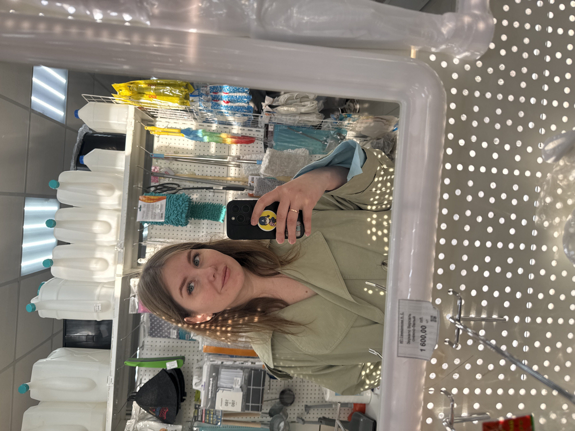 A female subject is depicted in a mirror selfie taken within a retail establishment located in Фролы, Russia. The woman, with light brown hair and blue eyes, is wearing a light olive-green trench coat over a light blue garment. She holds a black smartphone, featuring a Captain America PopSocket with a yellow background, in her right hand to capture the reflection. A gold-colored ring is present on her left ring finger. Dappled sunlight or artificial light patterns are visible on her hair, face, and clothing. The background, largely a reflection in the mirror, reveals shelves and pegboard displays stocked with various household and cleaning items. The uppermost shelf holds multiple white plastic jerricans with light blue caps. Below this, a pegboard displays black sauna hats, green cleaning tools, and mops with colorful fabric heads. Further to the right, shelves and more pegboards contain additional cleaning supplies, items in yellow plastic packaging, and various coiled ropes or cords. Overhead, the ceiling features white acoustic panels and fluorescent strip lighting. A visible price tag on the mirror frame identifies it as "Зеркало Версаль снежно-белый" (Versailles Snow-White Mirror), priced at "1 600,00 руб" (1,600.00 rubles), indicating it is a product for sale by "ИП Серебрякова Н.С." (Individual Entrepreneur Serebryakova N.S.) within a general merchandise or home goods store environment.