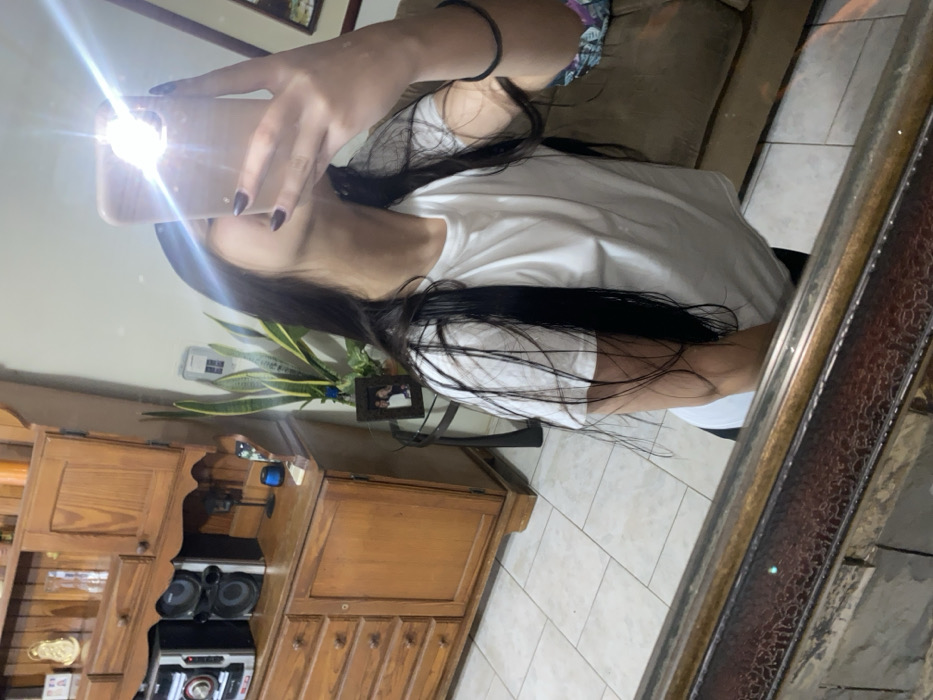 This image depicts an indoor residential setting, identified as Cotoperíz, Venezuela. The primary subject is a female, partially visible in a mirror selfie. She wears a white short-sleeved t-shirt and dark bottoms, with long, dark, possibly wet hair hanging forward. Her right hand, adorned with dark nail polish, holds a light-colored smartphone towards the mirror, with the phone's flash actively firing and creating a bright glare that obscures her face. A black elastic band is visible on her right wrist. The background, reflected in the mirror, features a large wooden hutch or cabinet with multiple drawers, solid doors, and upper shelves containing various items including a stereo system with two speakers, a golden figurine, and clear glass objects. To the right of the hutch, a tall snake plant stands next to a smaller plant, positioned on a dark stand with a framed photograph of two individuals. The wall behind the plants is light-colored, and a white wall-mounted device is visible. The floor is covered with light-toned square tiles. On the far right, a section of a light brown sofa with patterned cushions is partially visible. The mirror itself has a decorative, dark brown frame with a textured finish along its bottom edge.