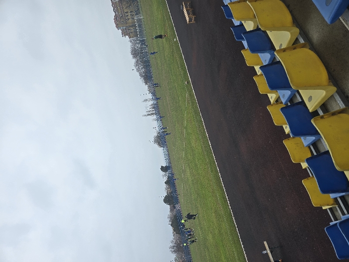 The image displays an outdoor sports stadium in Byala, Bulgaria, under an overcast sky. The viewpoint is from the spectator stands, looking down onto a running track and a sports field. In the immediate foreground, empty rows of stadium seats are visible, colored alternately in blue and yellow plastic. Below the seats, a dark, reddish-brown running track encircles a central green grass sports field. On the grass field, approximately 10 to 15 individuals are distributed across the playing surface. Most individuals are dressed in dark athletic wear, possibly blue or black uniforms. One person on the far left is observed in a crouched or bent-over position. Others are standing or in motion. A single white football is discernible on the grass near the center-right of the field. A light-colored wooden bench is positioned near the far right sideline, and a smaller table is located on the far left edge of the track. The background features a line of deciduous trees, mostly bare, stretching horizontally behind the field. Beyond the trees on the right, a multi-story building with a light-colored facade and a reddish-brown tiled roof is visible. The sky above is uniformly light gray and overcast, indicating cloudy weather.