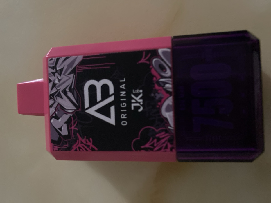 A disposable vape pen lies on a surface. The device is pink with a black label featuring a graphic design. The label includes a white "V3" logo and "ORIGINAL J.K's" text. Graffiti-style artwork borders the logo. A translucent purple cap covers the mouthpiece and has "7500" imprinted on it. The vape pen is horizontal.