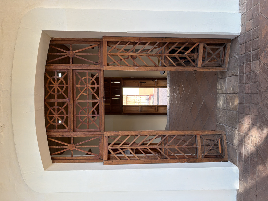 A partially obscured view shows an ornate wooden barrier. The structure features geometric designs including circles and diagonal patterns. It's framed by a white archway. Behind the barrier, a window is visible in an adjacent space. The right side opens onto a tiled area. The overall composition is architectural.