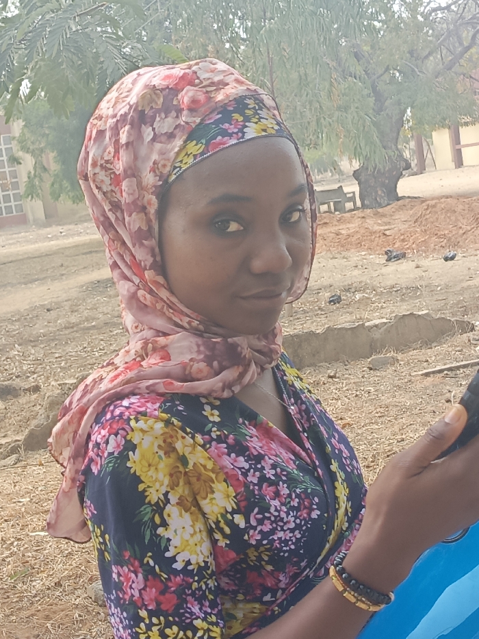 An outdoor scene in Kanti, Nigeria, shows a young adult female from the chest up, looking directly at the camera