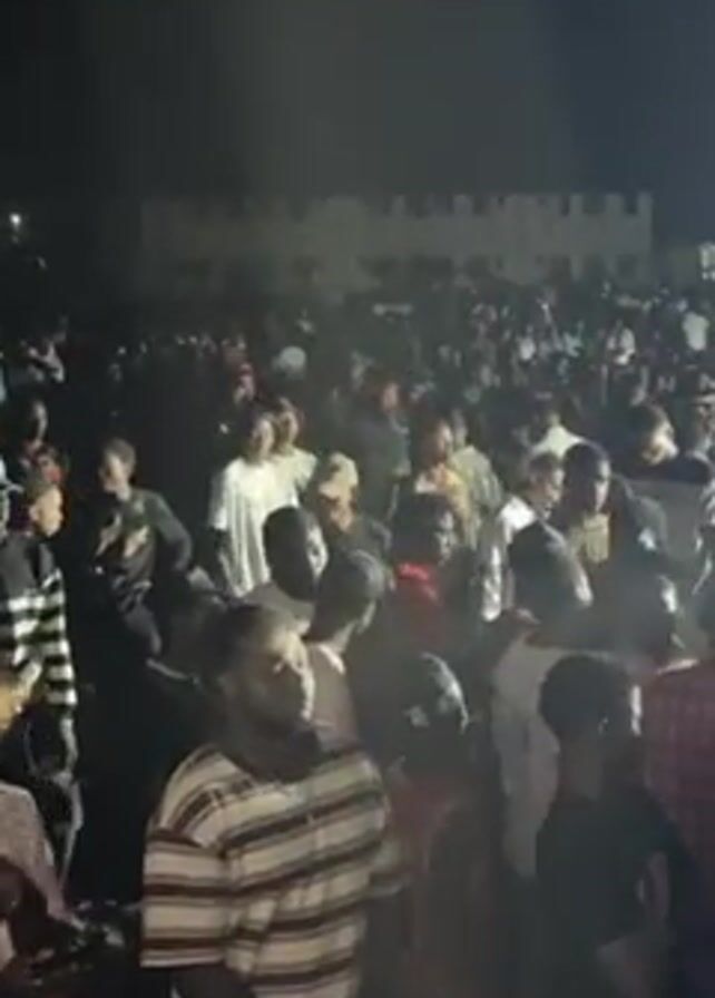 A large crowd of people is gathered in an outdoor space at night. The crowd appears to be densely packed, and most of the individuals are facing towards a focal point, possibly a stage or performance area. The crowd is predominantly composed of young adults. The lighting is dim, with some brighter spots possibly from stage lighting or spotlights illuminating sections of the crowd. In the background, there is a building with multiple levels, possibly a fort or an older structure. The overall atmosphere suggests a concert, festival, or large outdoor event.