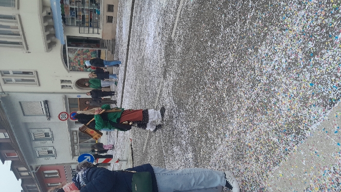 A street is covered in confetti, suggesting a celebration. People are visible on the street, including one individual dressed in a traditional outfit with a drum, likely part of a parade or performance. Buildings line the street, and street signs are present, adding to the urban environment. Some buildings appear to have historical architectural elements. The overall scene captures a festive atmosphere.