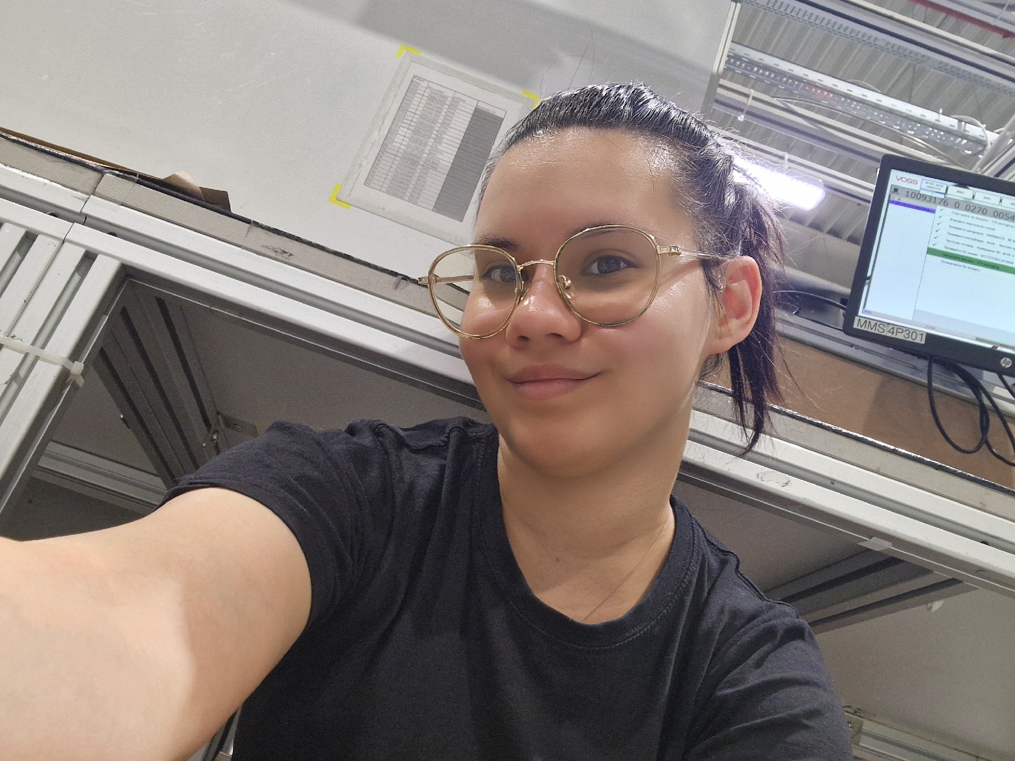 A person with light skin and dark hair pulled back is wearing glasses and a dark t-shirt. They are indoors, possibly in a manufacturing or industrial setting, indicated by the visible metal framing and equipment in the background. A computer monitor displaying text is visible on the right side. A document with a spreadsheet is taped to the wall. The location cannot be determined to be Bahovitsa, Bulgaria from the image alone.
