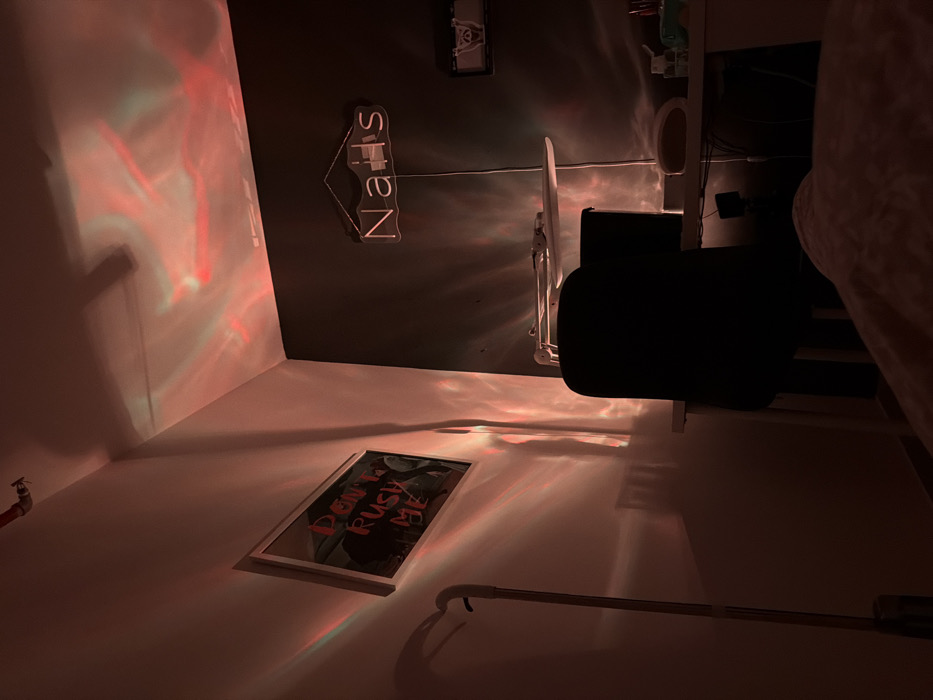 The image displays an interior room, likely a nail salon or personal workspace, located in Kiryat Motzkin, Israel. The scene is dimly lit with ambient red and green light patterns projected across the white ceiling and left wall, suggesting an artificial light source such as a nebula projector. On the left, a white wall features a rectangular framed picture containing red text that reads "DON'T RUSH ME." Above this picture, near the ceiling, a segment of a red pipe with a valve is visible. A metallic floor lamp stand extends upwards from the bottom left, partially obscured. The right wall is dark gray or black. Centered on this wall is a neon sign spelling "Nails," which emits a soft, visible glow. Below the sign, a light-colored desk is present, in front of which a dark-colored office chair is positioned. On the desk, a white articulated task lamp with a circular head is visible. To the right of the lamp, a white oval-shaped object, consistent with a UV/LED nail curing lamp, is present alongside small bottles and containers. Further back on the desk, a dark rectangular object, possibly a monitor or equipment, is discernible. No individuals are present in the image. The foreground, at the bottom right, shows a textured, light-colored fabric, possibly a blanket or upholstery.