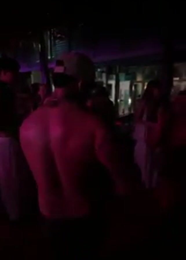 The video captures a dimly lit party atmosphere with a crowd of people. Many of the men are shirtless. The room is illuminated by purple and blue lighting. People are moving around, suggesting dancing, and there's audible music and cheering.